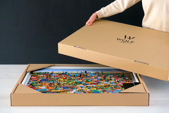 The print comes carefully packed in a sturdy cardboard box or tube which provides a safe and easy transport.